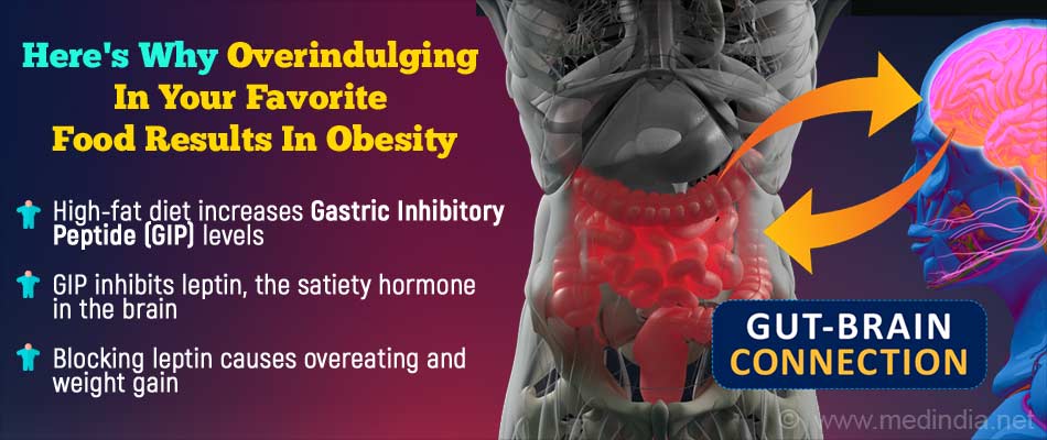Gastric Inhibitory Peptide (GIP), a hormone formed in the gut blocks the action of leptin, which is a satiety hormone formed in the brain. Leptin normally signals that we are full and tells us to stop eating. Blocking leptin, therefore, makes us overeat and pile on those extra pounds leading to obesity.