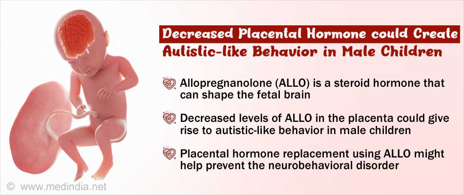 Decreased levels of allopregnanolone (ALLO) in the placenta can result in autistic-like behavior in male children. The reduction in the levels of the placental hormones triggered abnormalities in the cerebellum and changes in myelin sheaths.